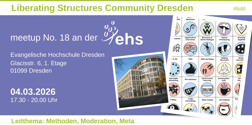 Am 04. März 2026 starten wir ins 18. meetup der Liberating Structures Community Dresden. Wir danken der Evangelischen Hochschule Dresden, die uns dieses Mal Raum und Snacks im „Atrium am Rosengarten“ zur Verfügung stellt.